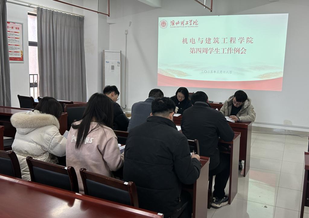 3月18日下午4时,机电与建筑工程学院第四周学生工作例会在行政楼214会议室举行,会议由院党总支书记助理邓金鑫主持,院团总支书记张亚飞及全体辅导员参会。