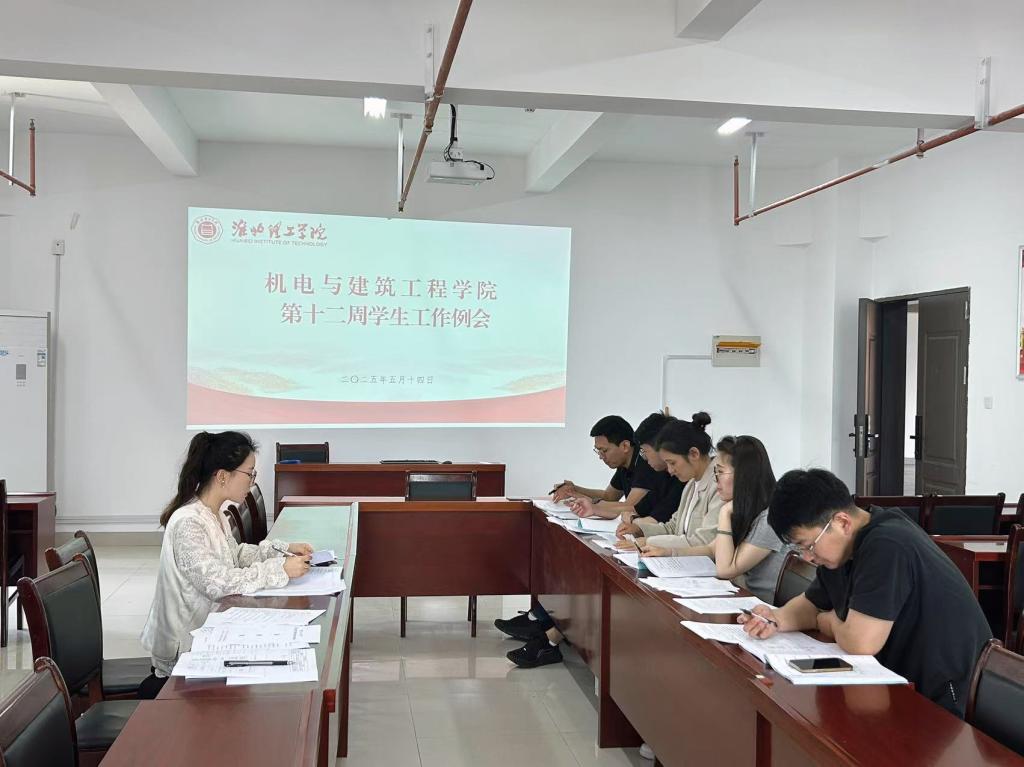 5月14日上午,机电与建筑工程学院在行政楼214会议室召开第十二周学生工作例会。学院党总支书记助理邓金鑫、团总支书记张亚飞、全体辅导员参加会议。