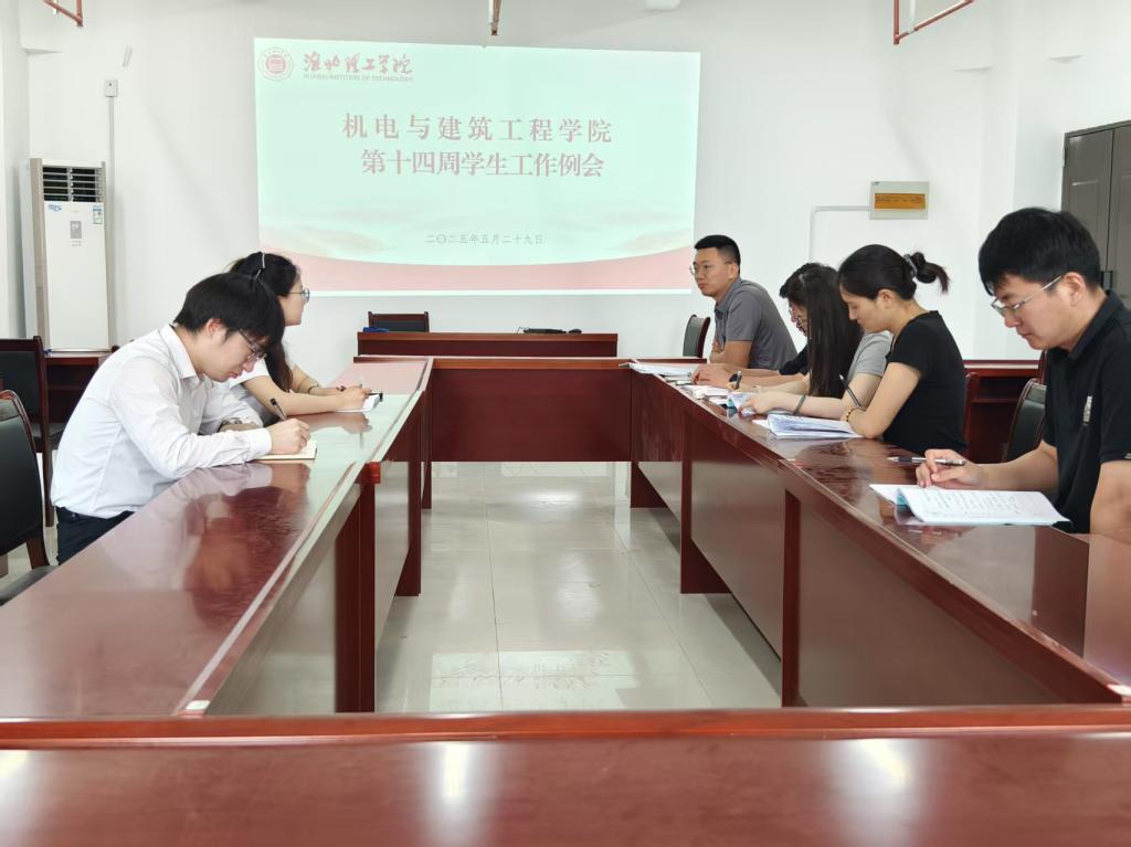 5月29日,机电与建筑工程学院在行政楼214会议室召开第十四周学生工作例会。学院党总支书记助理邓金鑫主持会议,团总支书记张亚飞及全体辅导员参会。