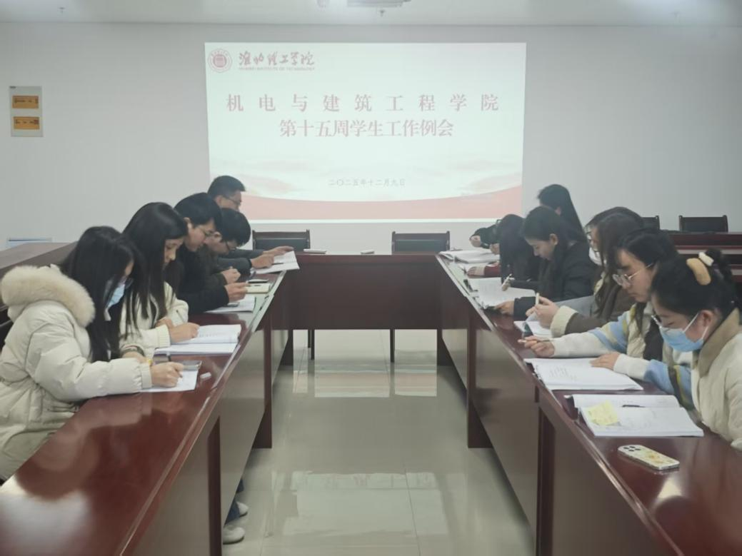 2025年12月9日下午,机电与建筑工程学院在行政楼922会议室召开本学期第十五周学生工作例会。会议由学院党总支书记助理邓金鑫主持,团总支书记张亚飞及全体辅导员参会。