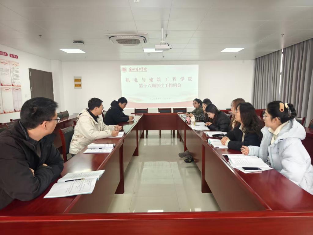 2025年12月17日上午,机电与建筑工程学院在行政楼922会议室召开本学期第十六周学生工作例会。会议由学院党总支书记助理邓金鑫主持,团总支书记张亚飞及全体辅导员参会。