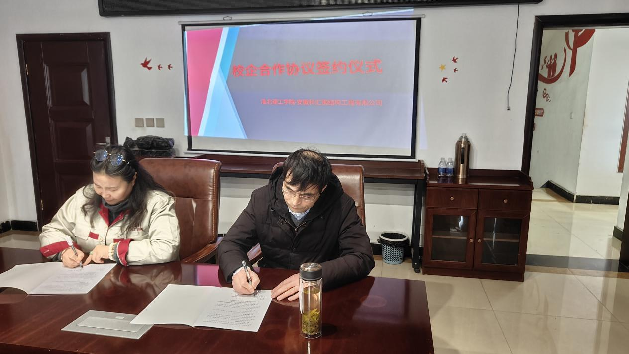 为提升我校人才培养质量和加强校企合作交流,2023年12月15日上午,机电与建筑工程学院与安徽科汇钢结构工程有限公司举行校企合作签约暨授牌仪式。参加人员有机电与建筑工程学院院长张安宁、院长助理及建筑工程教研室主任梁龙喜、孙冠晓和段代昭等老师,以及公司董事长杨波、总工程师彭永、经营副总张小永和项目经理武贯军。