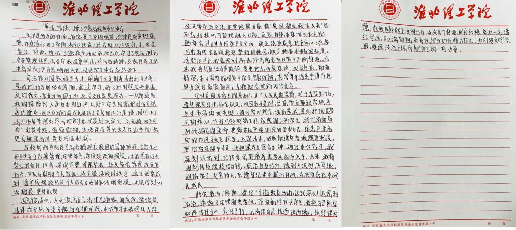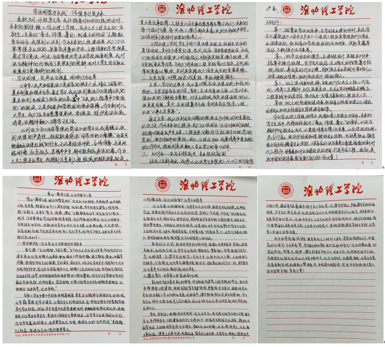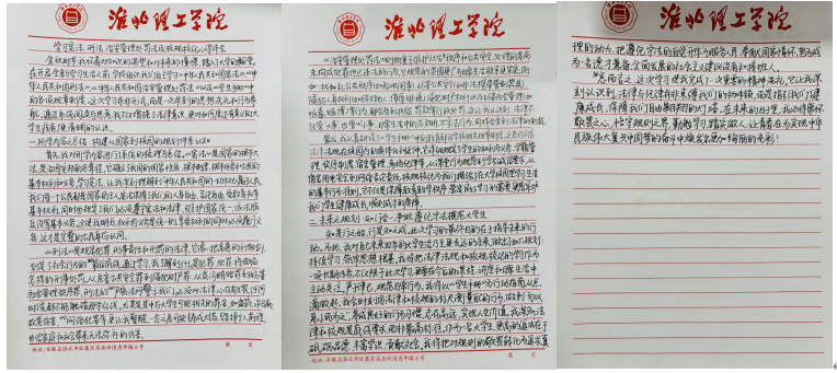 在自主学习阶段,同学们认真研读法律条文与校规校纪,结合自身成长经历和大学生活规划,梳理知识点、记录学习感悟。不少同学表示,此次自主学习让自己对法律的严肃性和校规的重要性有了更深刻的认识,也意识到法治素养是当代大学生不可或缺的基本素养。随后,同学们严格按照要求,撰写不少于1000字的手写学习体会,内容涵盖法律法规与校规校纪的学习总结、结合自身情况的深刻反思,以及未来遵法守纪、修身立德的具体规划。所有心得稿件均统一使用印有best365英国在线体育官网标识的信纸书写,字迹工整、卷面整洁,充分展现了机电与建筑工程学院新生的良好学风。