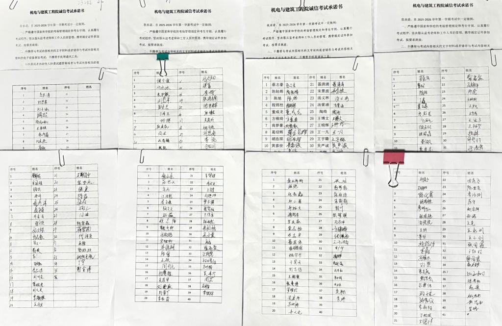 为进一步加强学风建设,严肃考纪考风,引导学生自觉树立诚信意识、端正考试态度,营造公平、公正、有序的考试环境,机电与建筑工程学院于2025年12月22日至25日,组织各年级于一号教学楼集中开展了“诚信考试”期末主题教育班会。本次班会由各班辅导员主持,学院全体学生参与。